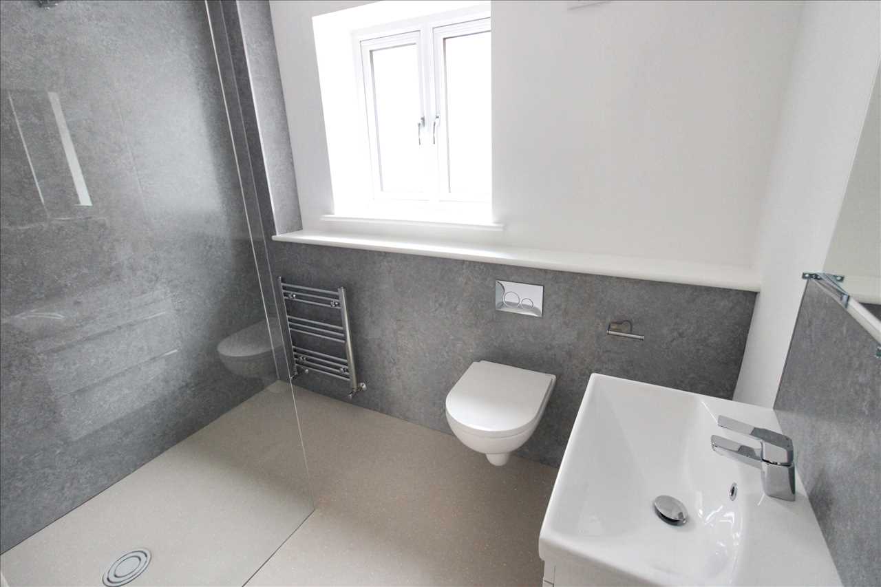 Frosted double glazed window. Shower room comprising of wash hand basin, w/c and walk in shower. Please note this is an example photograph.