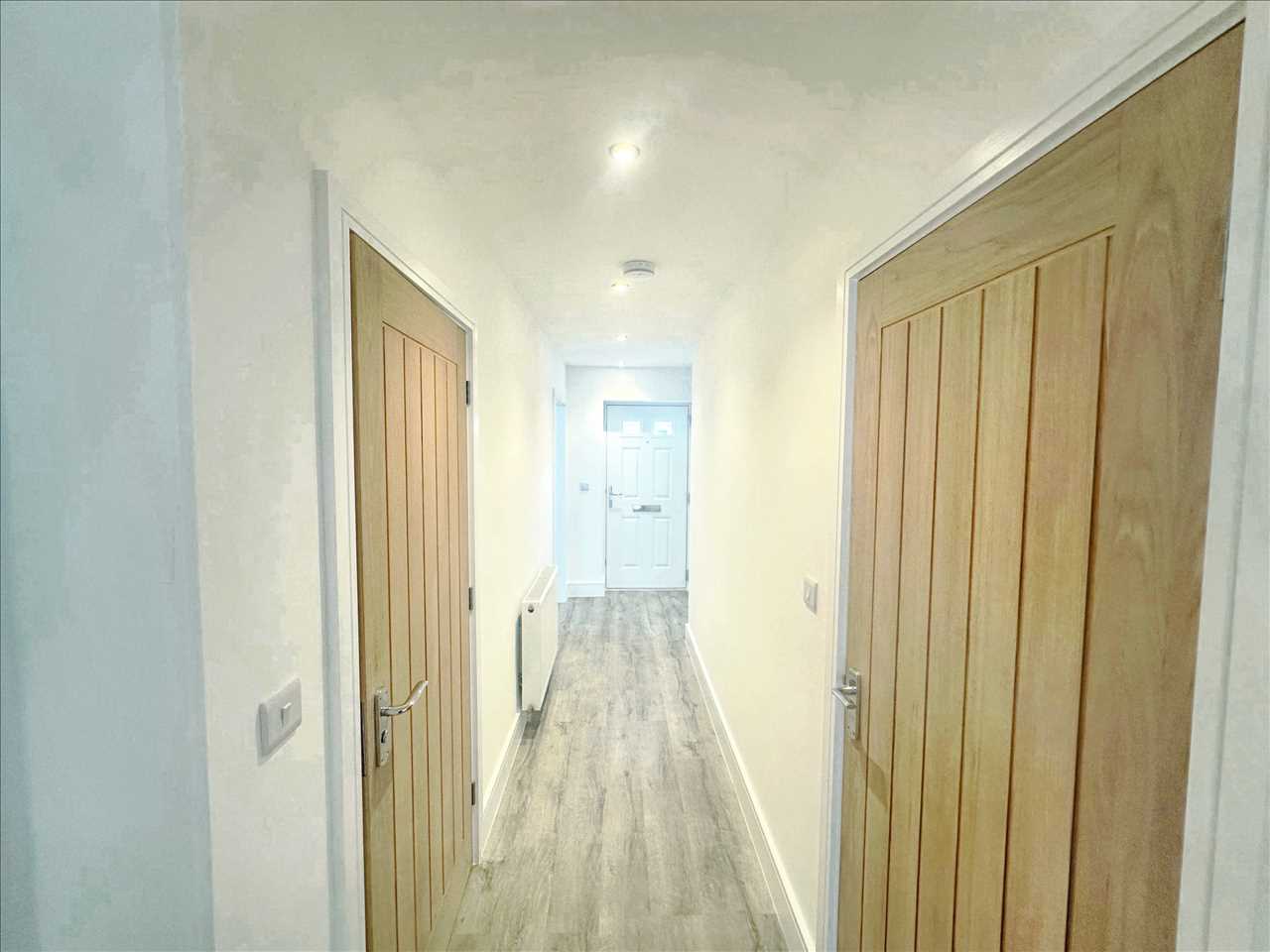 Private door leads to the entrance hall, access to the open plan lounge/diner/kitchen, two bedrooms and shower room. Spotlights to the ceiling and central heating radiator.