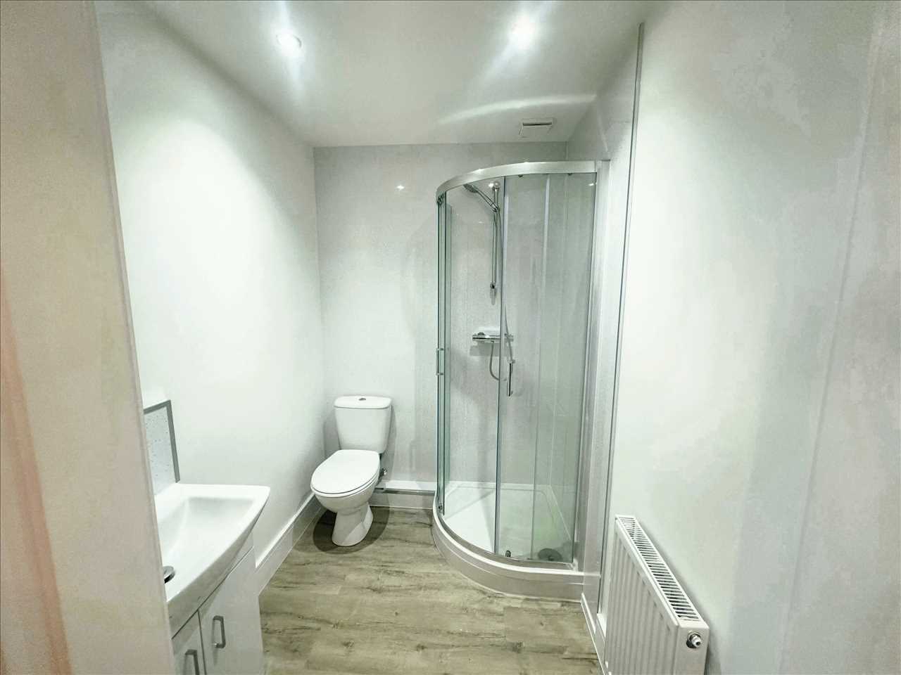 White suite comprising of walk in shower cubical with shower over, pedestal wash hand basin and low flush w/c. Central heating radiator. Spotlights to the ceiling.