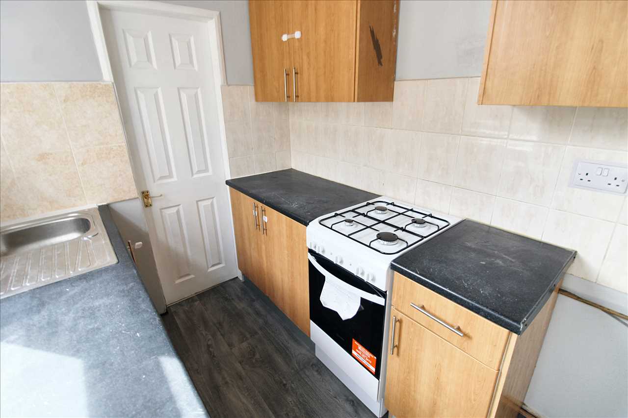 Double glazed window to the side elevation, door to the side leading to the enclosed rear garden. Stainless steel sink unit with mixer taps and side drainer inset into roll edge work surfaces, a range of base and wall units. Tiled splash back areas. Access to the bathroom.