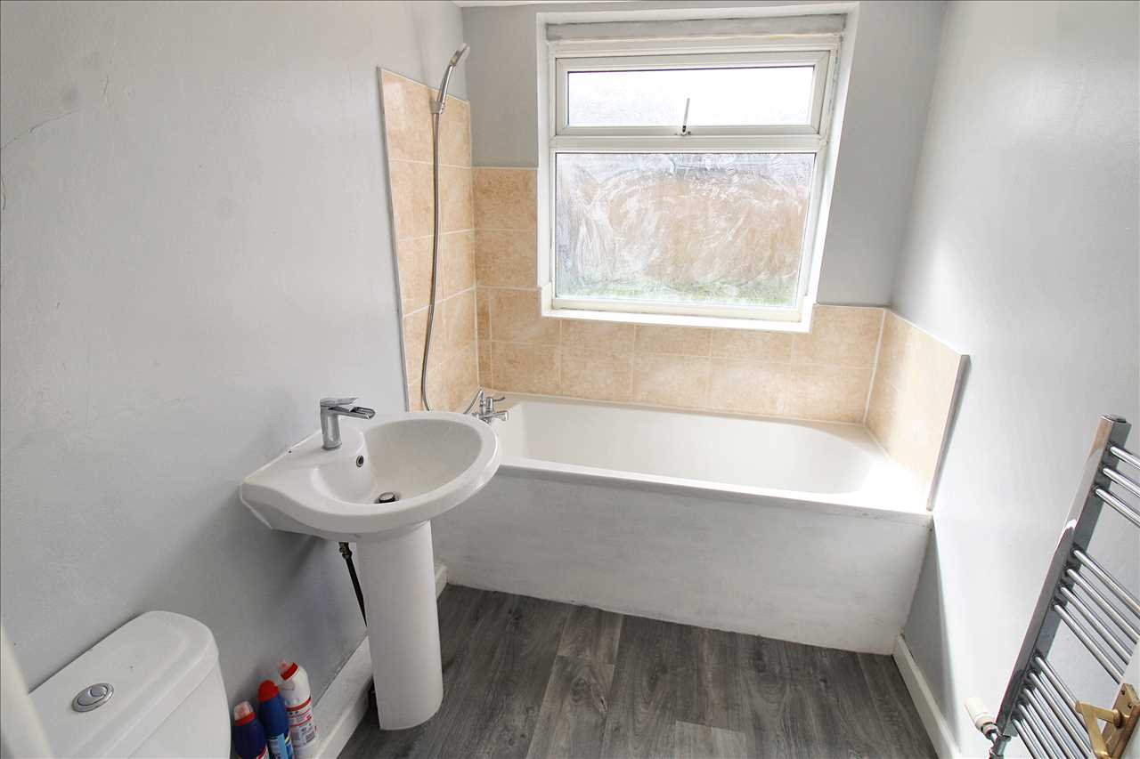 Double glazed window to the rear elevation, white suite comprising of panelled bath, pedestal wash hand basin and low flush w/c. Chrome heated towel rail.