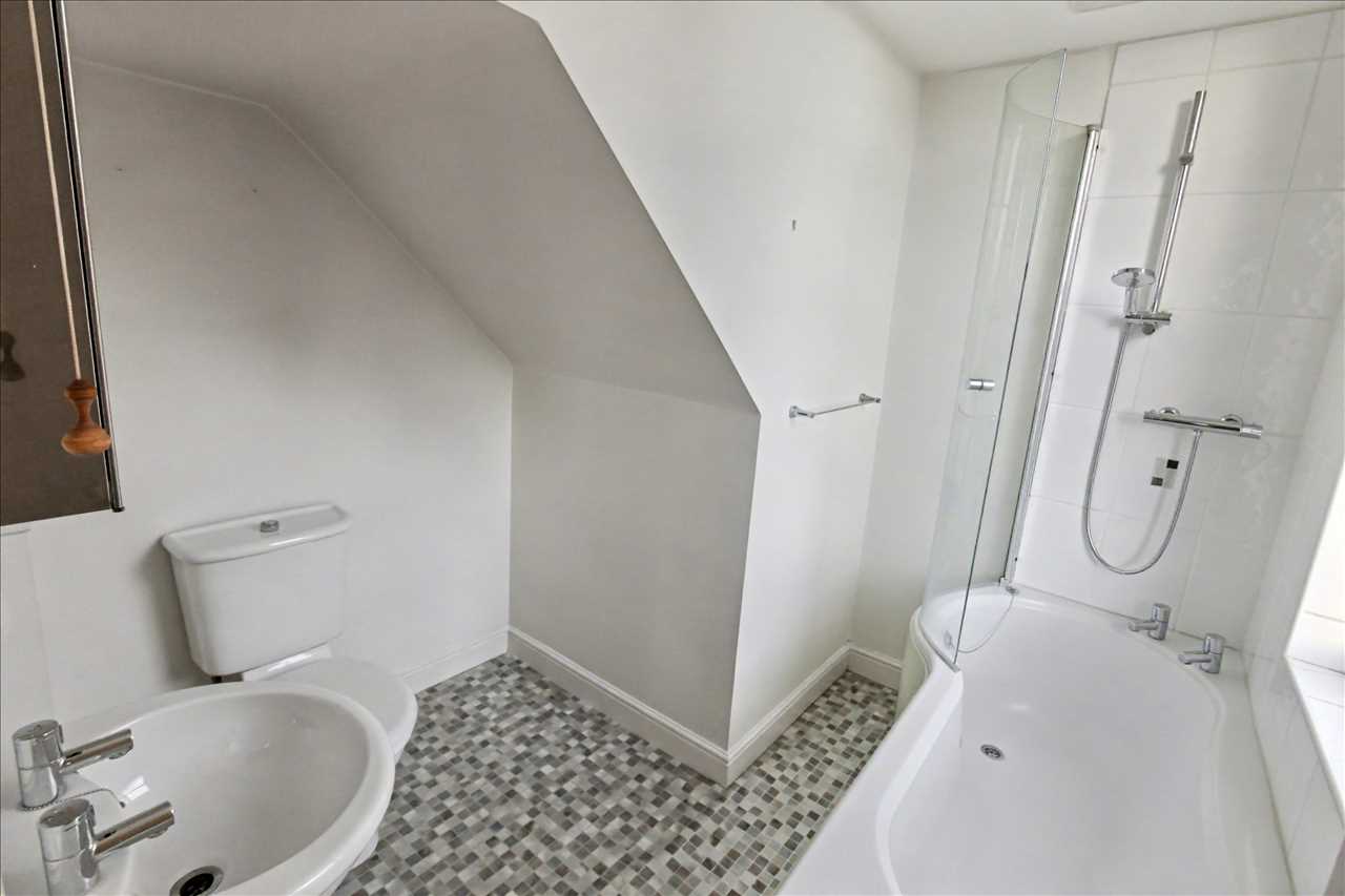 Frosted double glazed window, white suite comprising of panelled bath with shower over, pedestal wash hand basin and low flush wc.