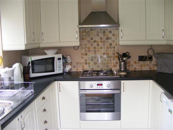 Comprising of a stainless steel sink unit wit mixer taps and side drainer inset into roll edge work surfaces, a range of base and wall units. Built in oven hob and extractor hood. Plumbing for automatic washing machine. Door leading to the rear garden.