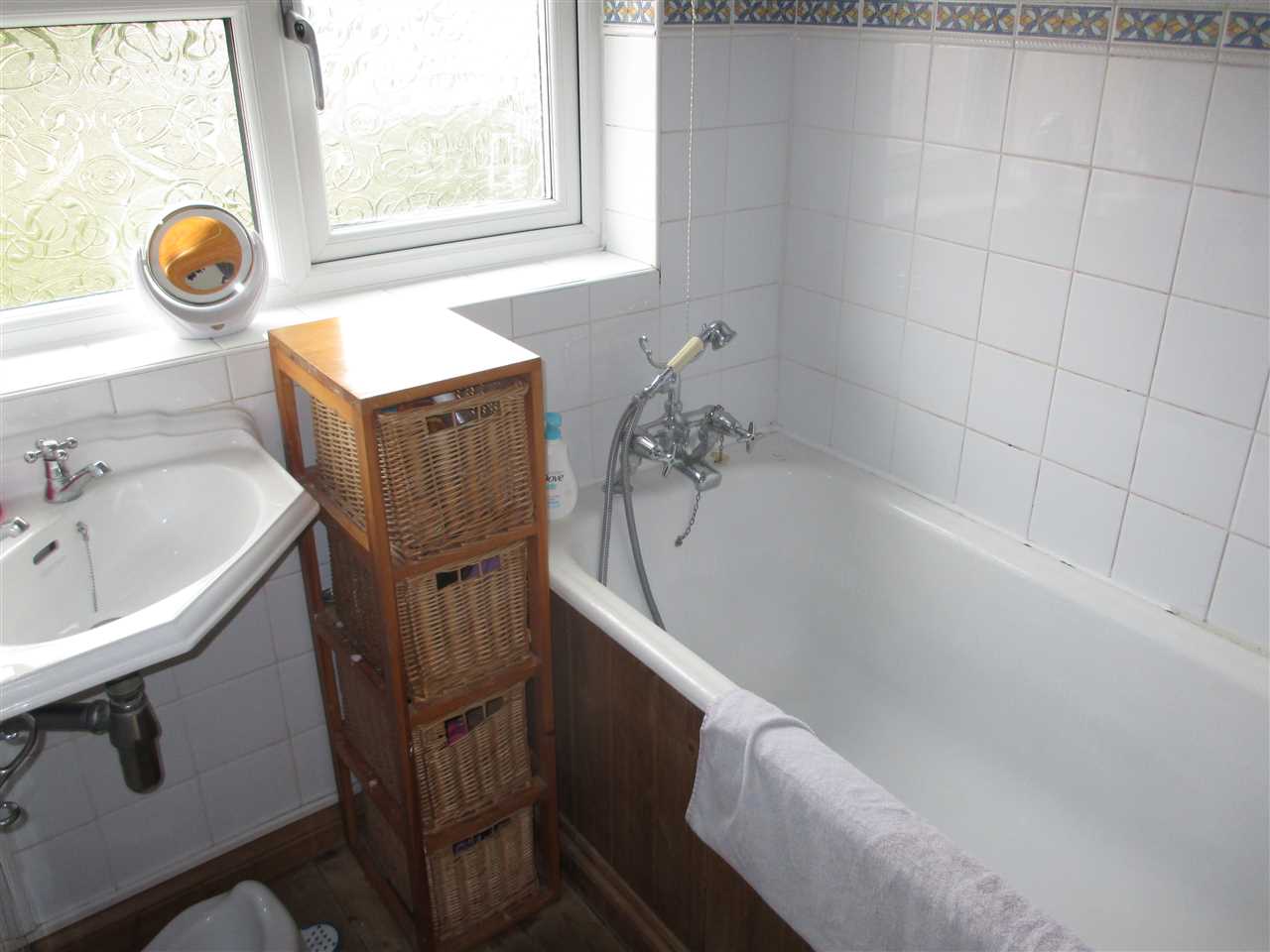 Double glazed frosted window, panelled bath and wash hand basin. Tiled splash back areas.