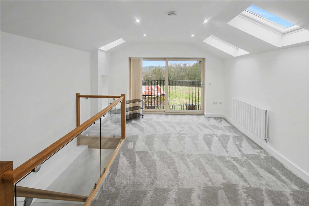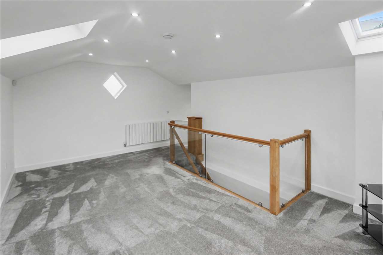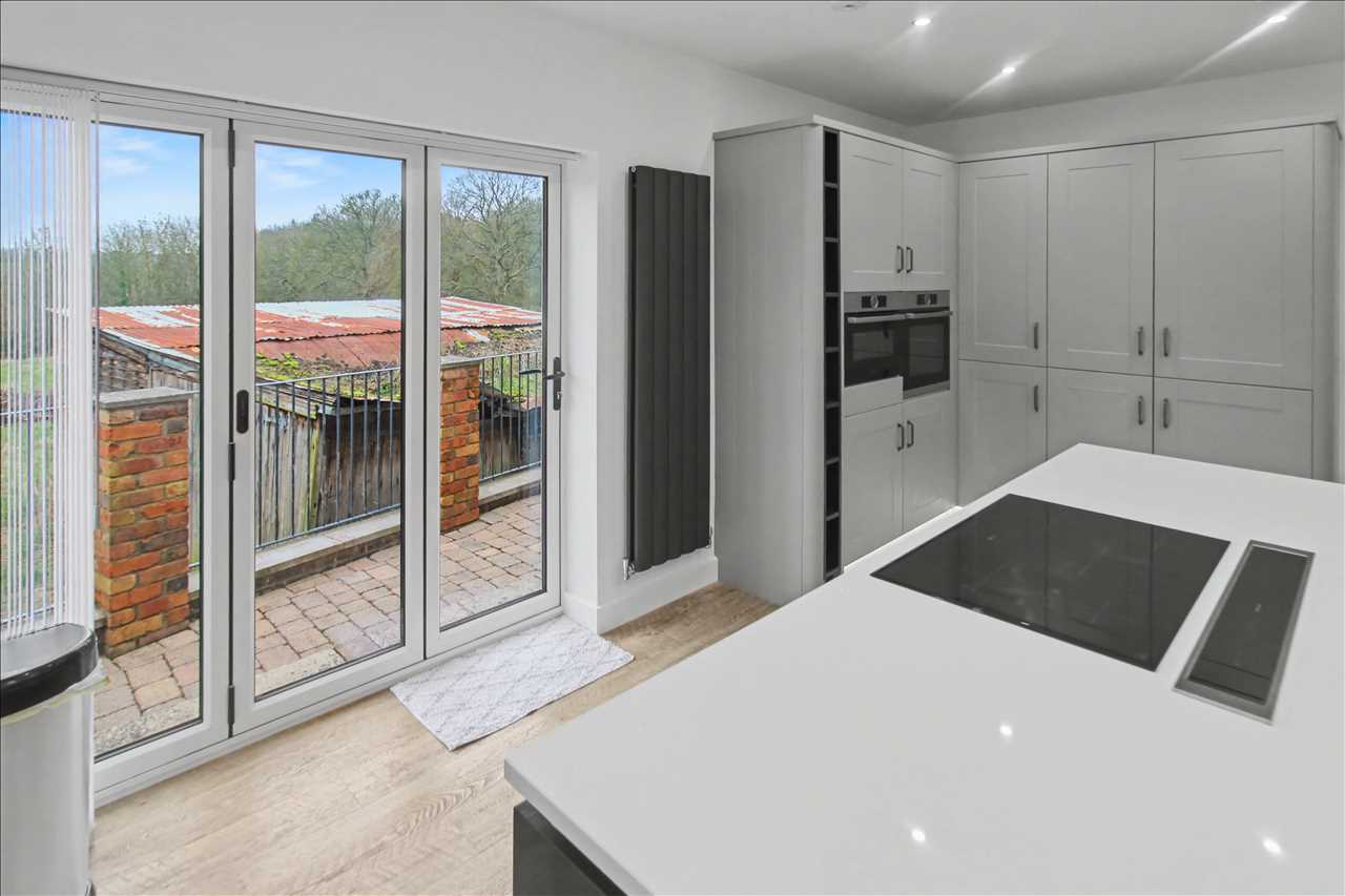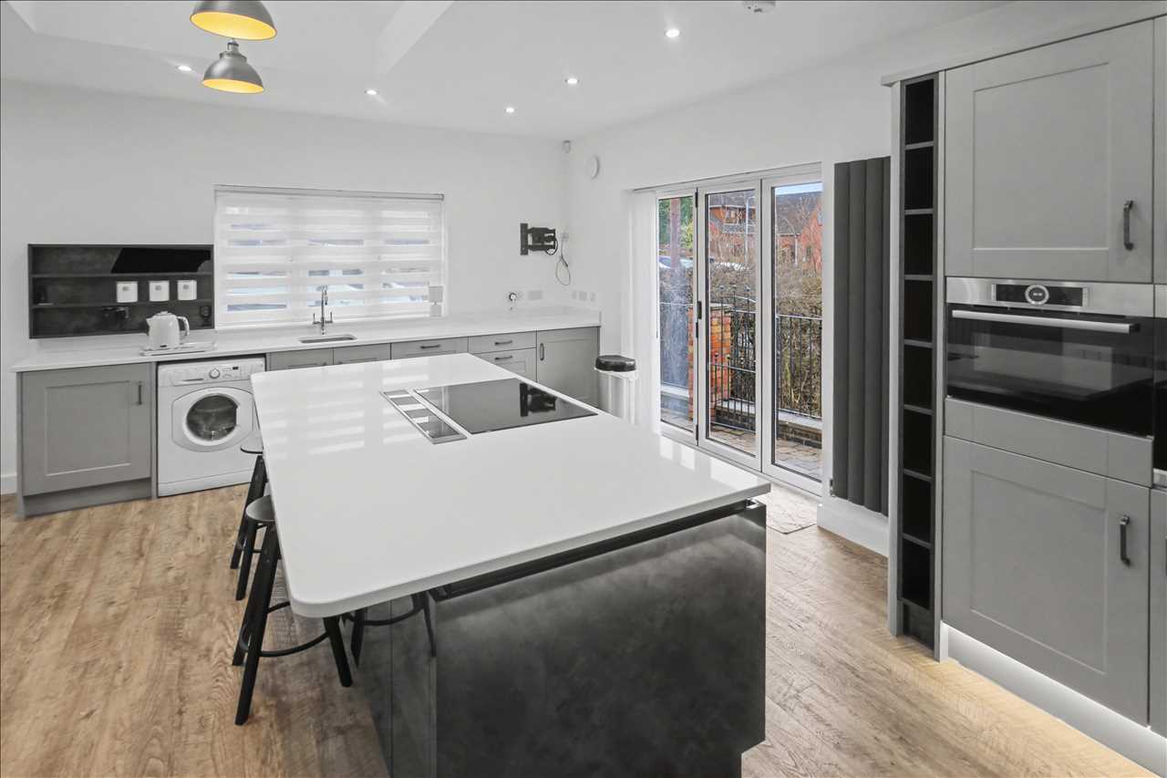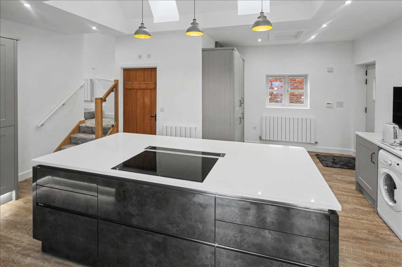 Stunning bespoke kitchen with a full range of base and wall units with fitted appliances including double oven, hob and work surface inset extractor, sink unit with mixer taps inset into work surfaces, island bar area with seating area, vaulted ceiling with skylight and spotlights, led lighting to the kitchen units. Bi fold doors opening onto the garden terrace. Central heating radiator. Access to the shower room and access to the lounge.