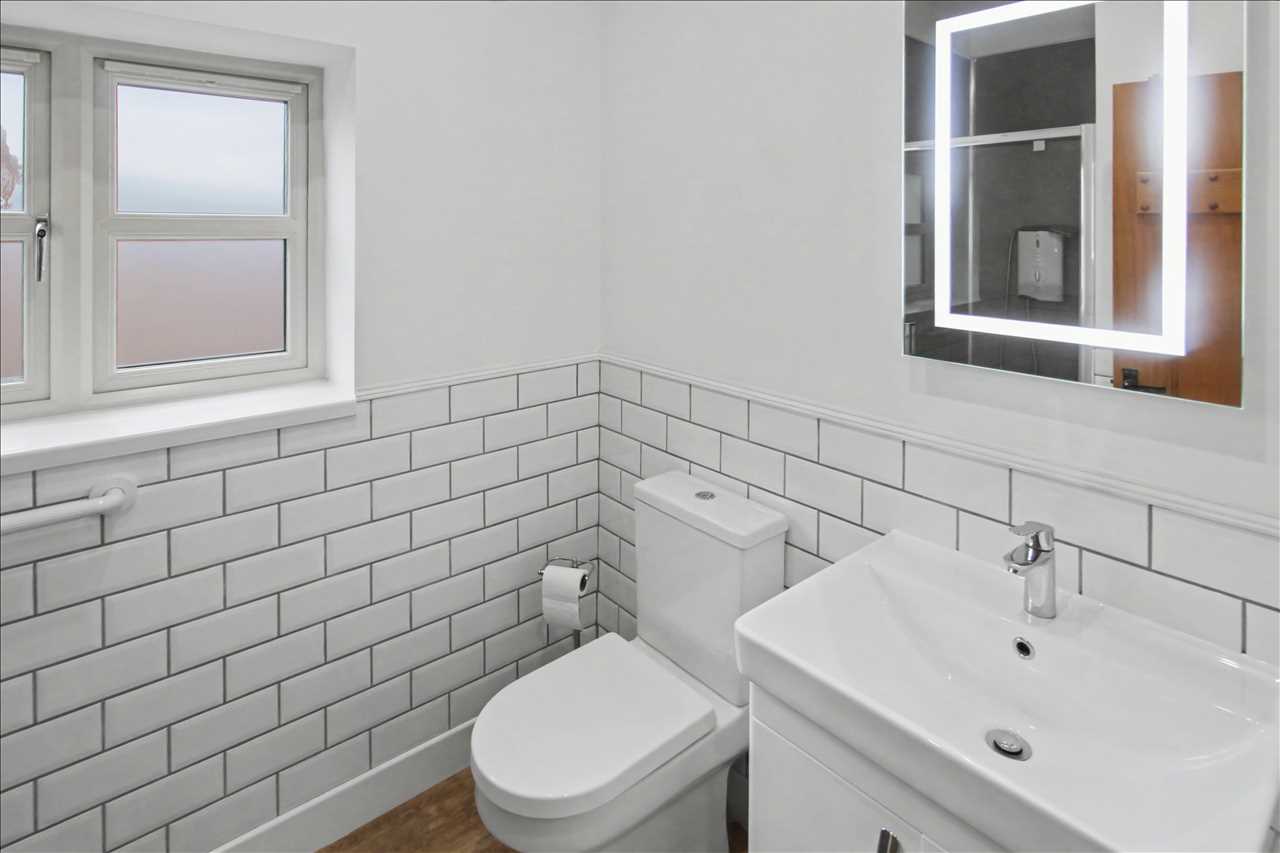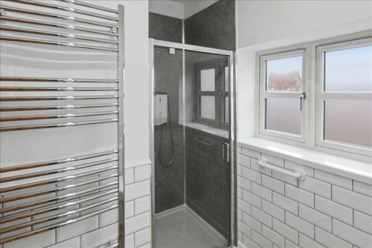 Frosted double glazed window. White suite comprising of a walk in shower cubical, wash hand basin with storage below and low flush wc. Tiling to the walls. Chrome heated towel rail.