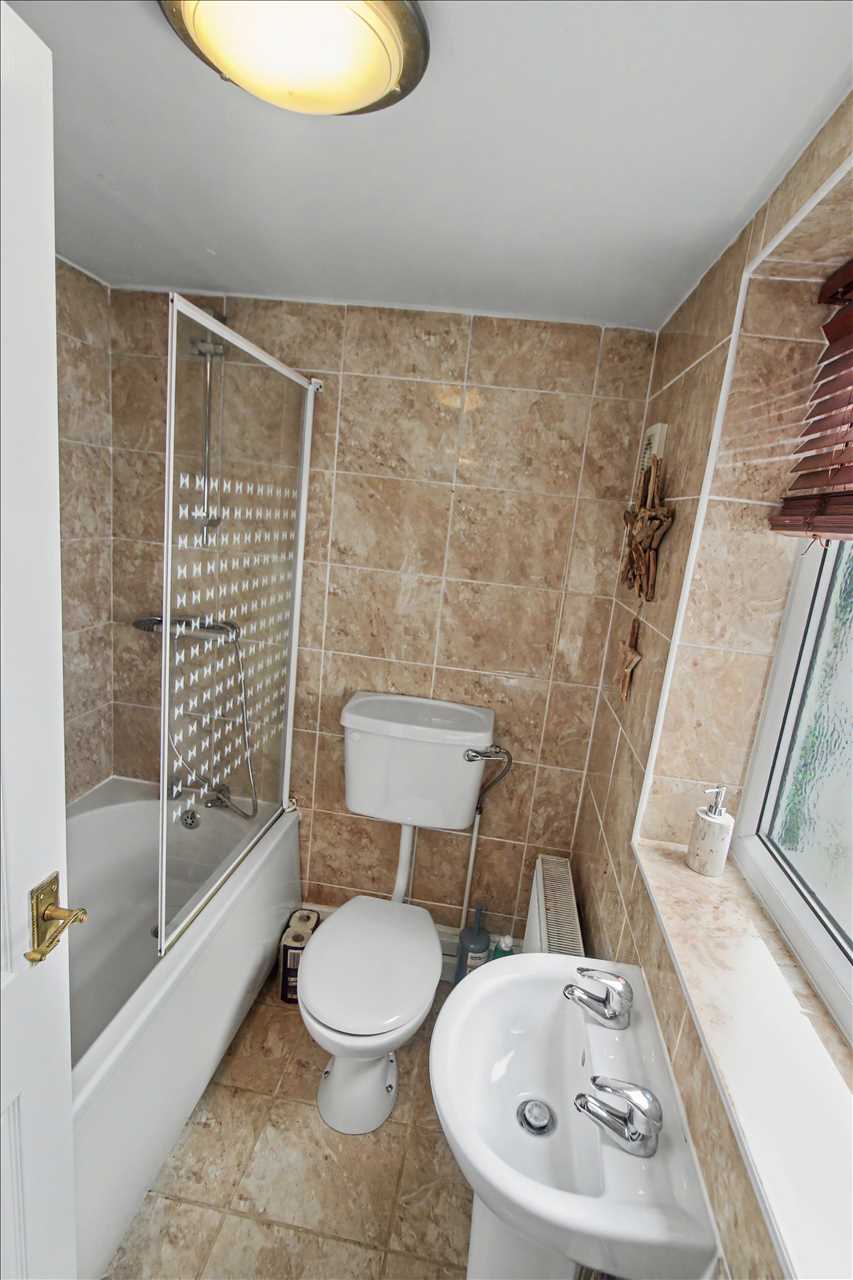With three piece suite comprising panelled bath with shower over and glass shower screen, vanity hand wash basin, low flush wc, tiled walls, obscure double glazed window and radiator