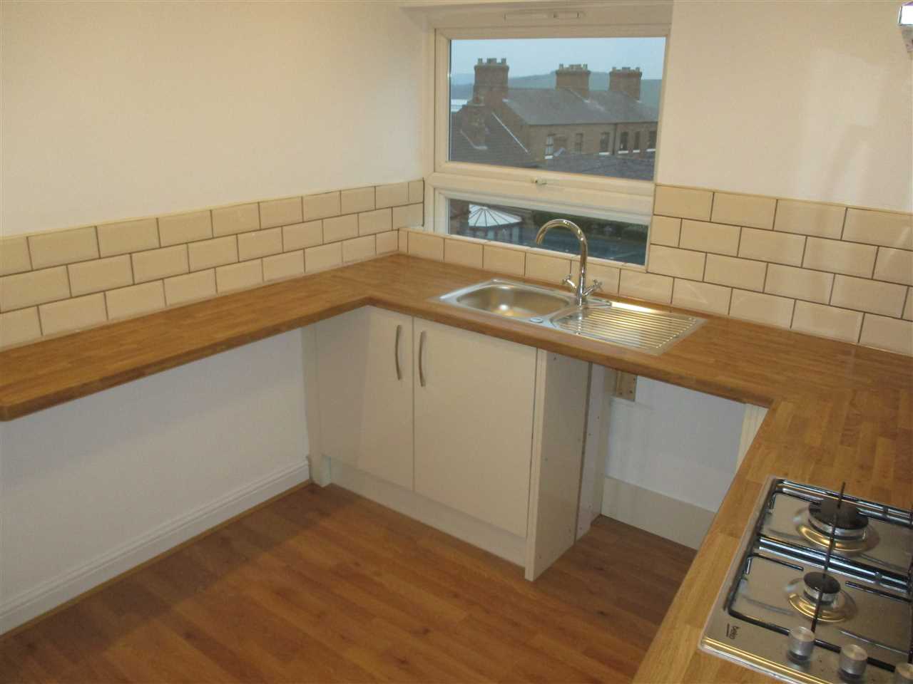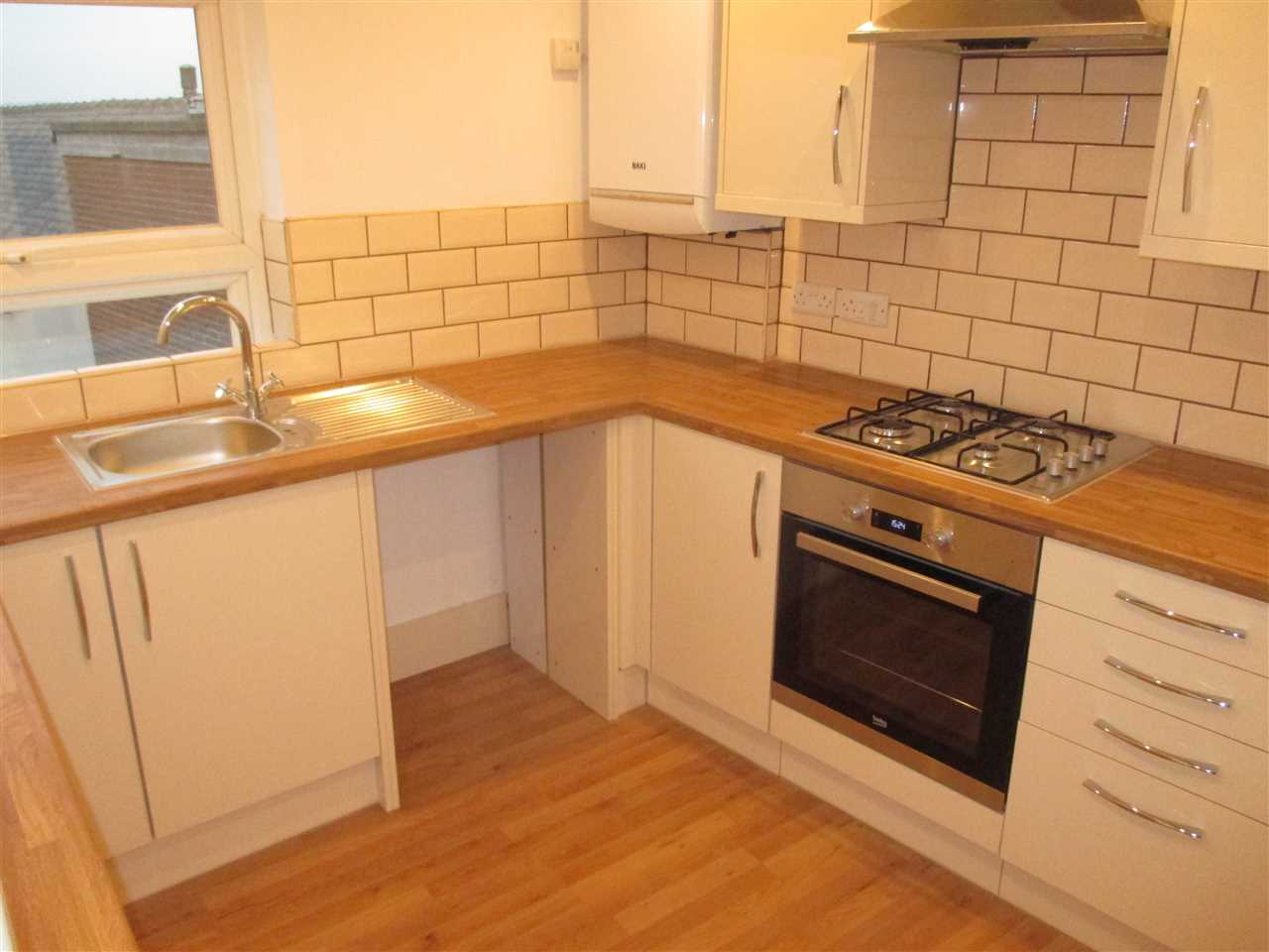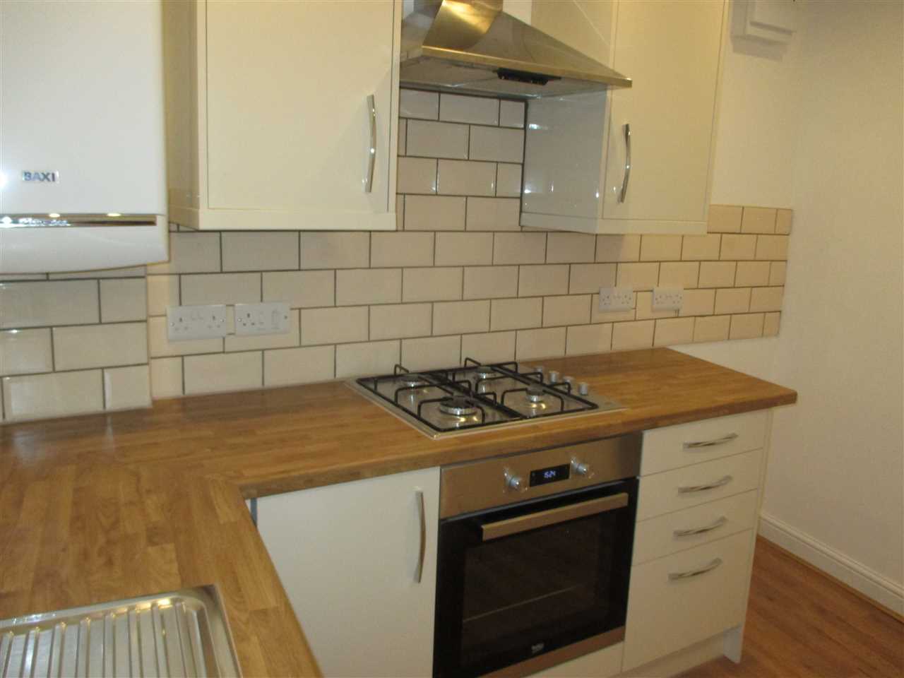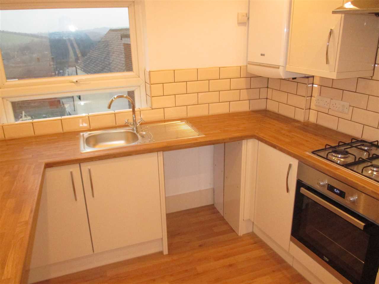 Double glazed window to the rear elevation. Stainless steel sink unit with mixer taps and side drainer inset into roll edge work surfaces with a range of base and wall units. Built in oven hob and extractor hood. Tiled splash back area.