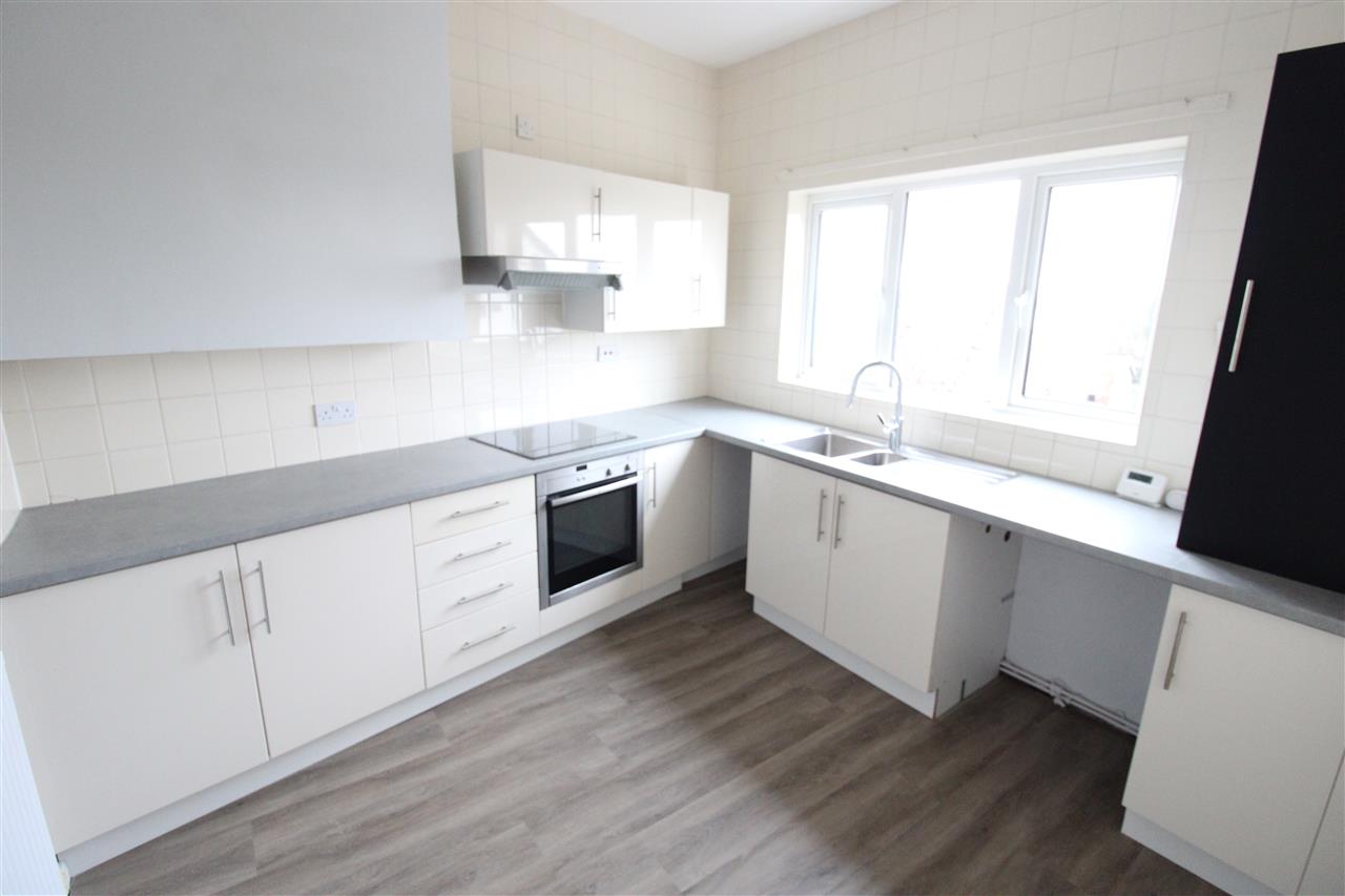Double glazed window to the rear elevation, refitted kitchen comprises of a one and a half bowl sink unit with mixer taps and side drainer, inset into roll edge work surfaces, a range of white high gloss base and wall units with built in oven hob and extractor hood. Plumbing for automatic washing machine. Tiled splash back areas.