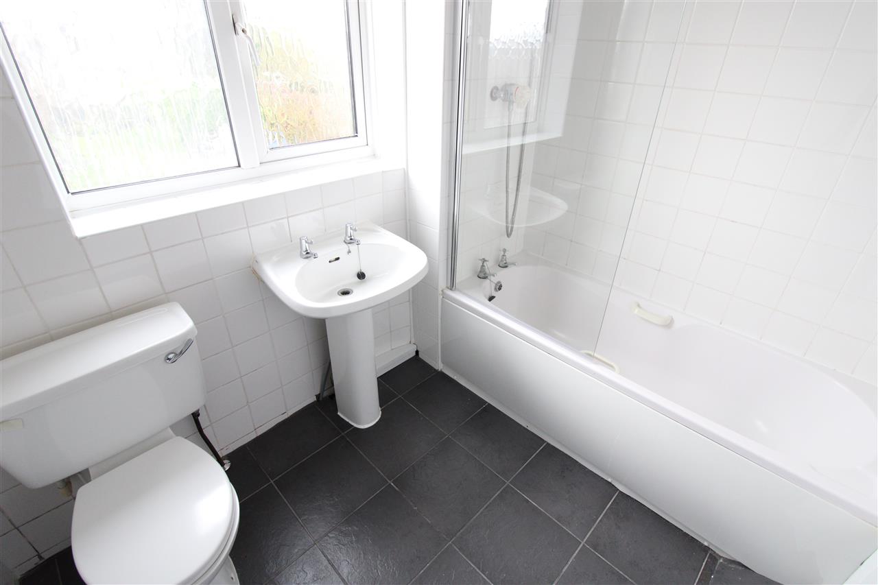 With double glazed frosted window to the rear elevation white three piece suite comprising of panelled bath with shower over, pedestal wash hand basin and low flush w/c. Tiling to walls and tiling to floor.